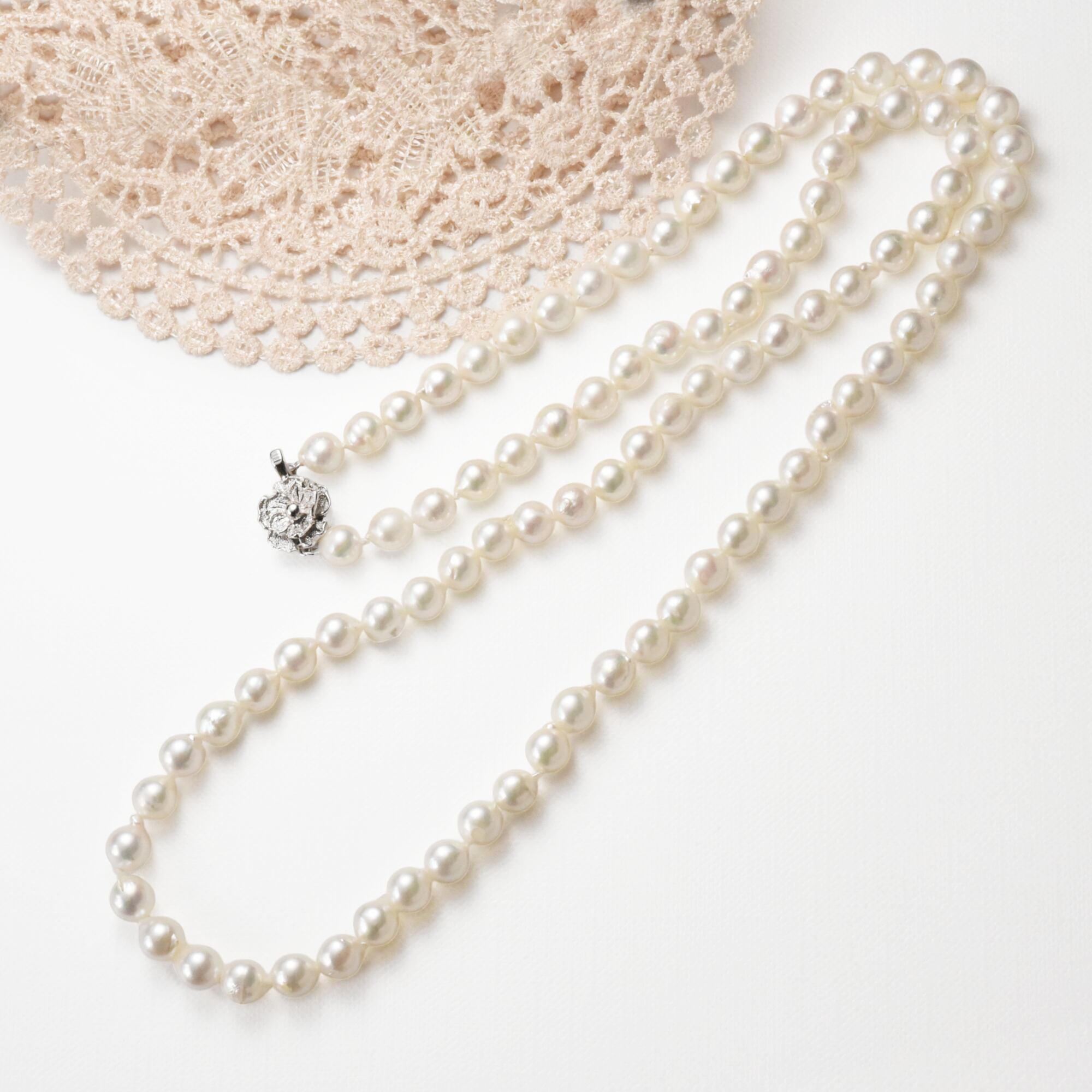 パールはアコヤ真珠。約7.5-8mmサイズの珠で、真珠のサイズもそれなりのボリューム感がありますが、加えてネックレス2本分の材料を使った80cmのロングネックレスなのでさらに存在感たっぷり!