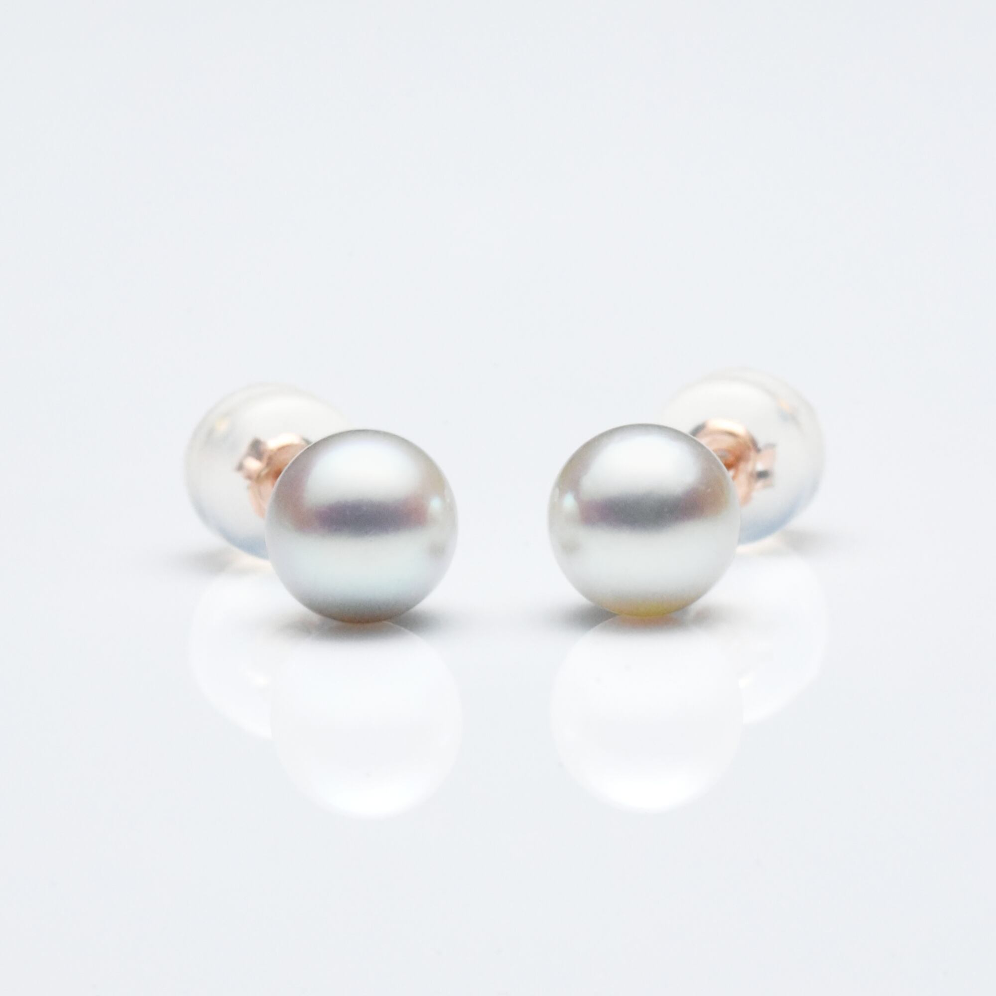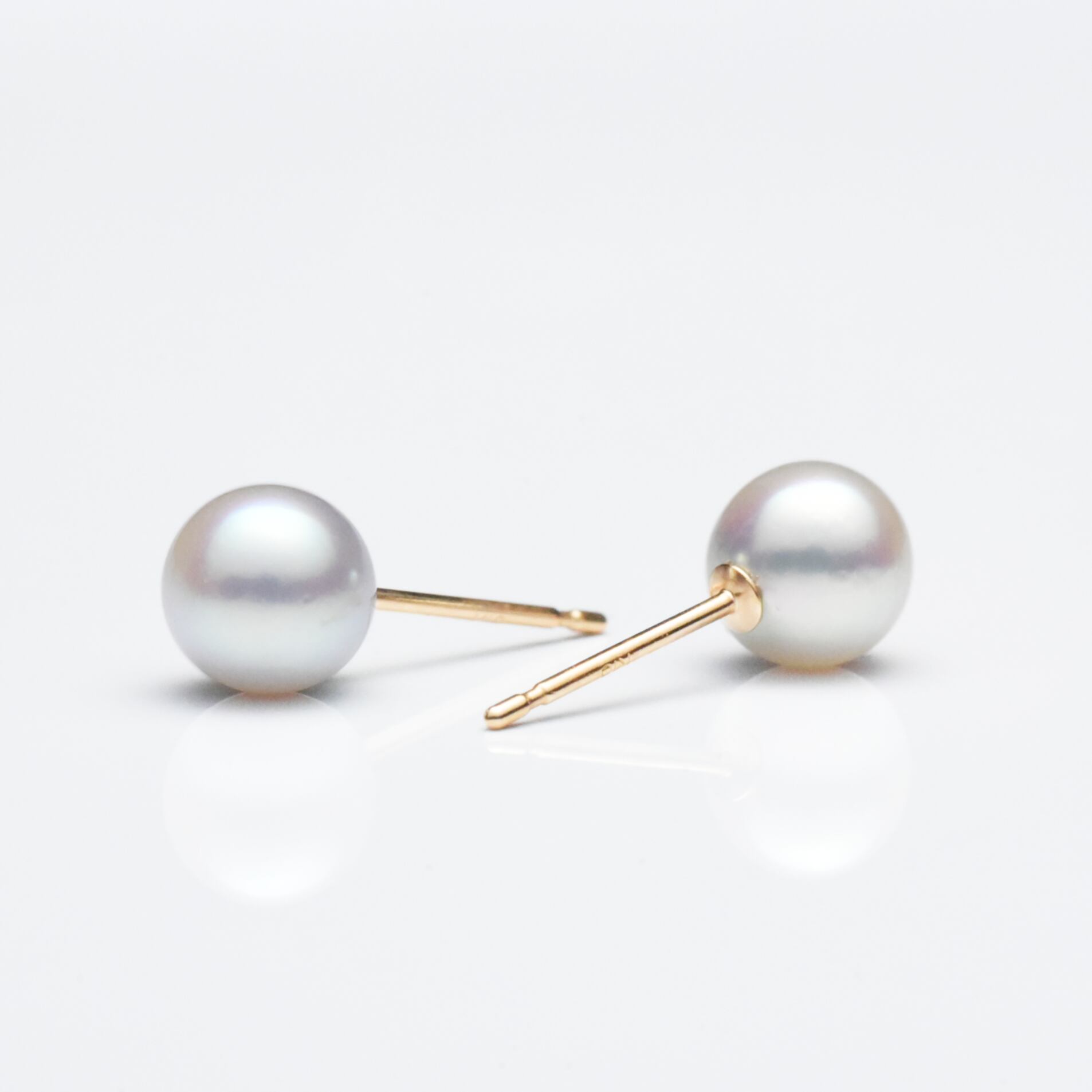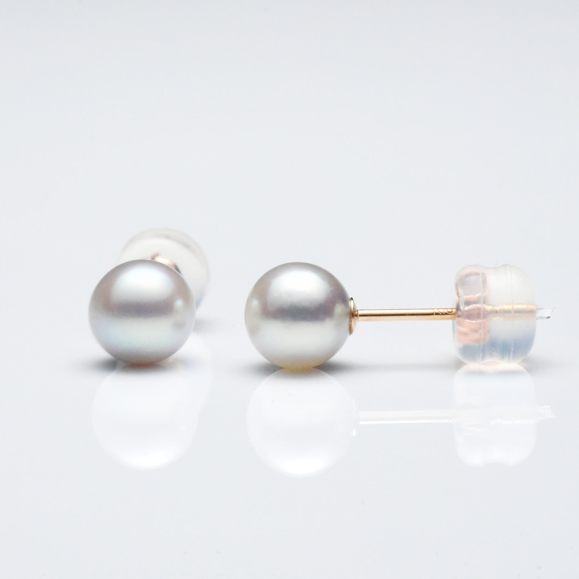 ■ ワントーン落ち着いた、静かな雰囲気を感じる外観をしたアコヤ真珠のピアスです。青みを帯びたグレーは人為的に着色したものではなく、ナチュラルカラー。真珠が育つ際に暗色をした有機物などが取り込まれ、その色が真珠層を透過することで色づいている、自然が偶然もたらしたカラーです。黒やグレーの真珠は用いられるシーンが限られているようなイメージがありますが、サイズが約5.5-6mmとやや控えめなボリュームなので、固めの装い以外にも、デニムやシャツなどの普段使い用にも合わせられます。真珠の形はほぼラウンドシェイプ。キズこそ点々と有りますが、テリ感や巻き感に優れたものを使用しました。狙って作るものではないため、白に比べて流通量が少ない希少なパールですが、是非普段使いでもお楽しみください!