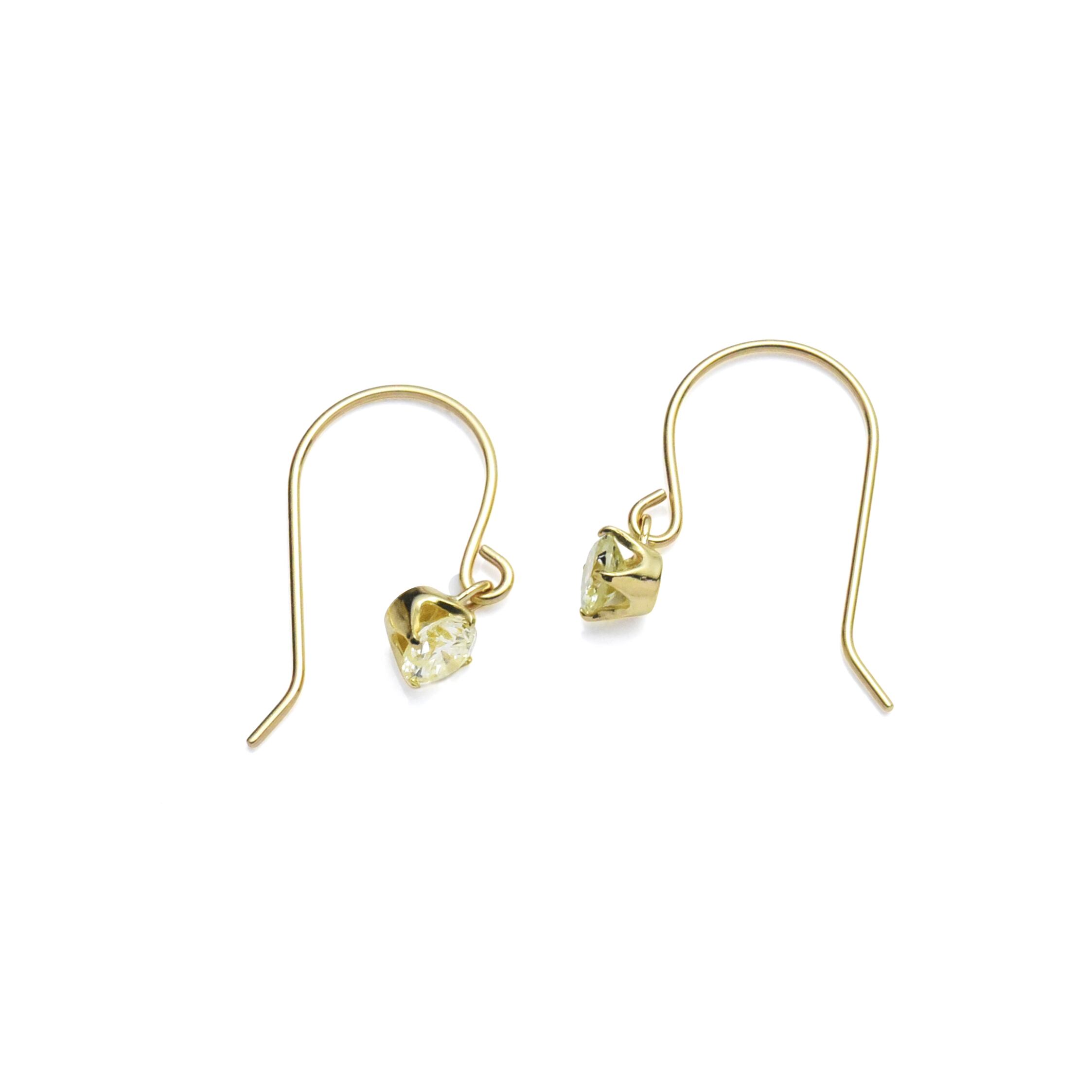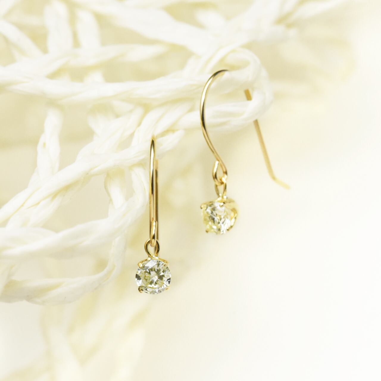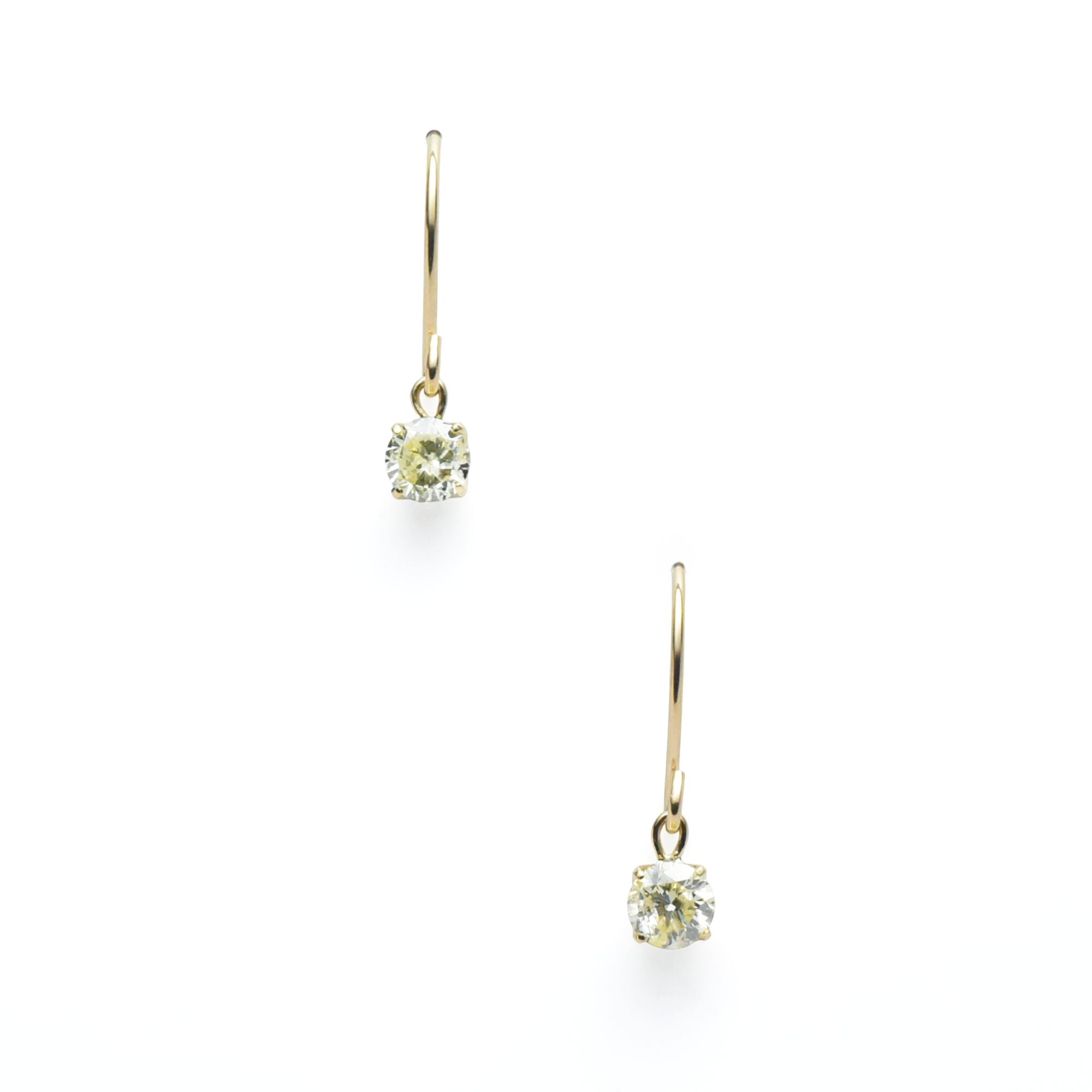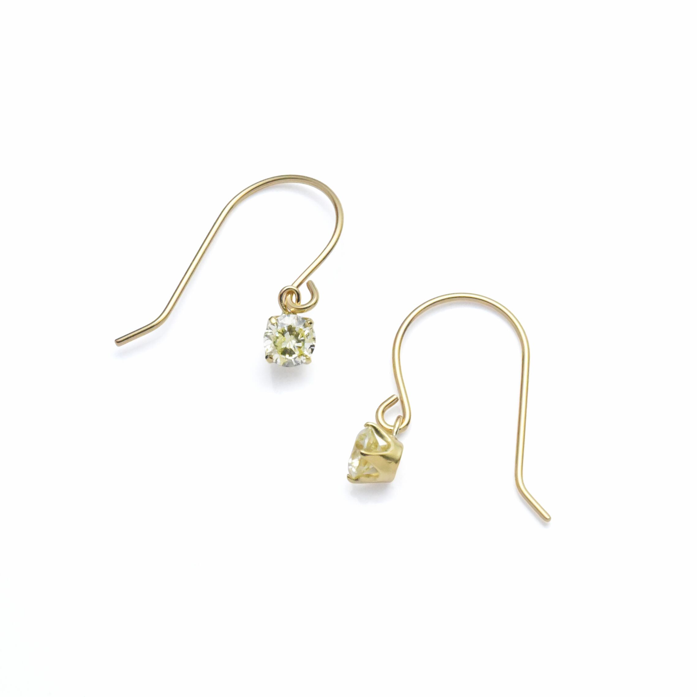 ■ 顔周りを明るく華やかに彩る淡いイエローダイヤのフックピアスです。ベリーライトイエロー系、直径約3mmのダイヤモンドが片耳に0.1ctずつ、合計0.2ct使用した揺れるタイプのフックピアスで、動くたびにダイヤモンドがキラキラと輝きを放ちます。「ケープ」シリーズのイエローダイヤで、内包物も肉眼で見えるレベルで入っている、実は合成ダイヤモンドではまだ作られていない、天然ダイヤだけで楽しめる個性のある宝石。4本爪のシンプルデザインで、サイズ感もさりげないので、普段使いをはじめ幅広く活躍してくれます。