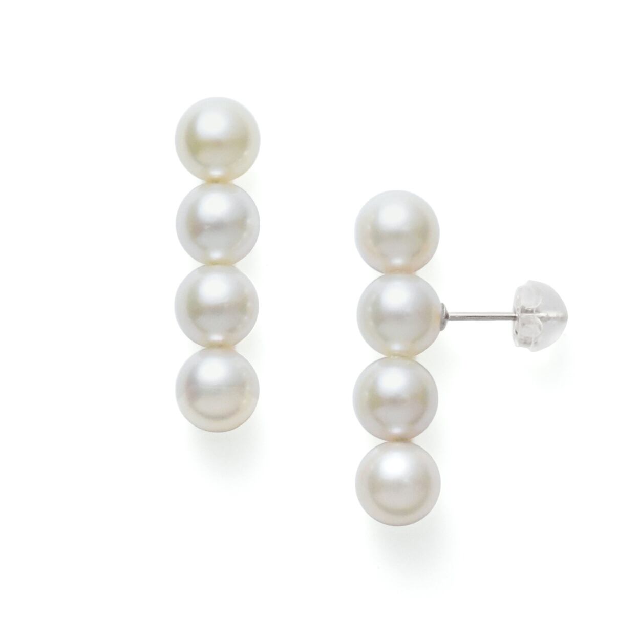 一粒ピアスでオーソドックスなサイズの約6-6.5mmのアコヤパールを4つも並べ、幅は約2.5センチほどもあり、帽子や眼鏡やマスクなどを着用していてさえ、遠目からでもしっかり着け映えするピアスです。デザインそのものはシンプルなので、主張はするけれど合わせやすいアイテムです。