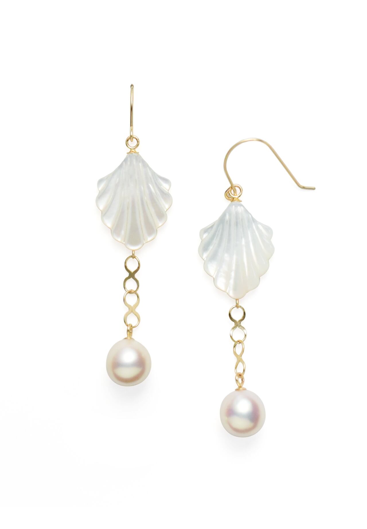 大き目のシェルモチーフと7‐7.5mmの淡水パールが揺れるデザインで、縦4cmとしっかり存在感がありますが、素材の輝きが上品なのでコーディネートを壊さず合わせやすいデザインです。