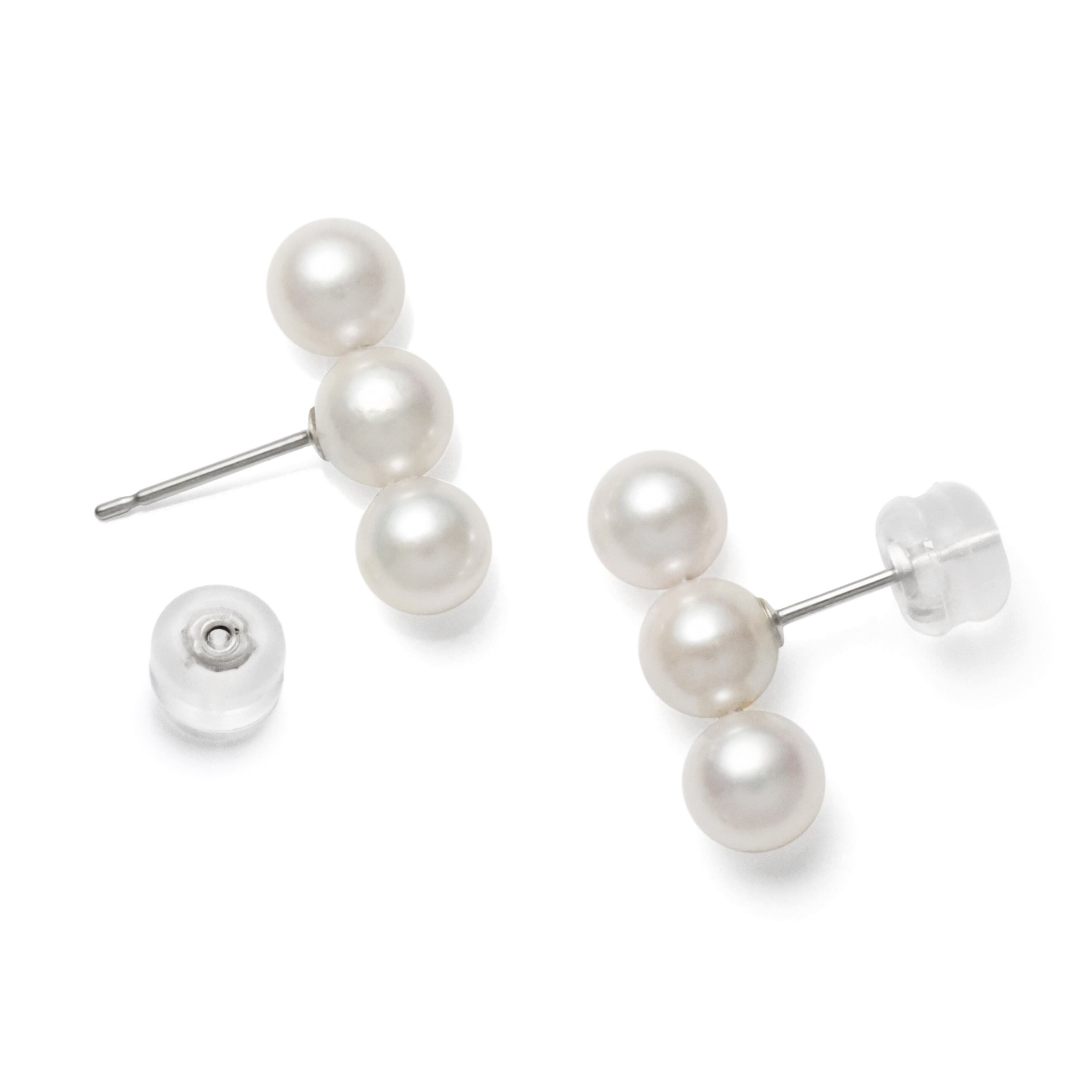 5~5.5mmのかわいいサイズのパールを縦に3つ並べたシンプルなデザインですが、縦に1.5cmほどのサイズ感があり、また少し変形していたりキズはある物のテリの良い真珠を使用しているため、ちゃんと存在を主張してくれます。