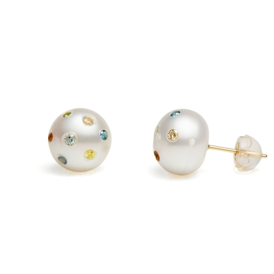 直径約9−10mmほどのボタンシェイプの淡水パールに、片耳に合計7石のグリーン・ブルー・イエロー・ブラウンなどのトリートカラーの天然ダイヤを散りばめたデザインで、カジュアルな外観ながら本物の宝石の輝きで上質さもアピールしています。