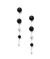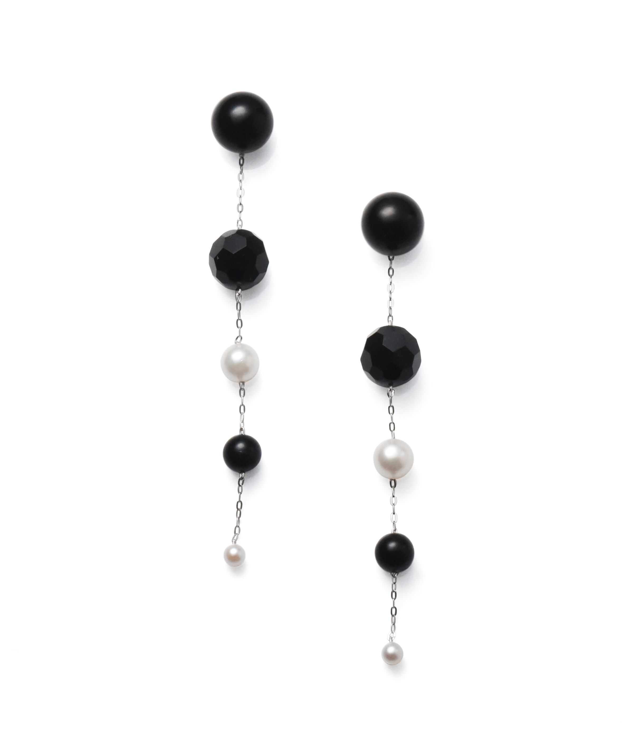■ 白・黒・グレーの無彩色が顔まわりの雰囲気を上品に引き立ててくれるピアスチャームに、オーソドックスなジェットの10mm玉スタッドピアスをセットにしました。ピアスチャームは黒玉「ジェット」と白いアコヤ真珠をプラチナのチェーン上に2個ずつ交互に、サイズグラデーションであしらったデザインで、耳もとのジェットは多面カットされた10mm。その下に6-6.5mmのあこや真珠、6mm丸玉のジェット、最後に3.5-4mmのあこや真珠と、色のコントラストは強いですがなだらかなサイズの変化と、素材がギラギラと強い主張をしない宝石のため、かえってお手持ちのピアスを品よく引き立ててくれます。