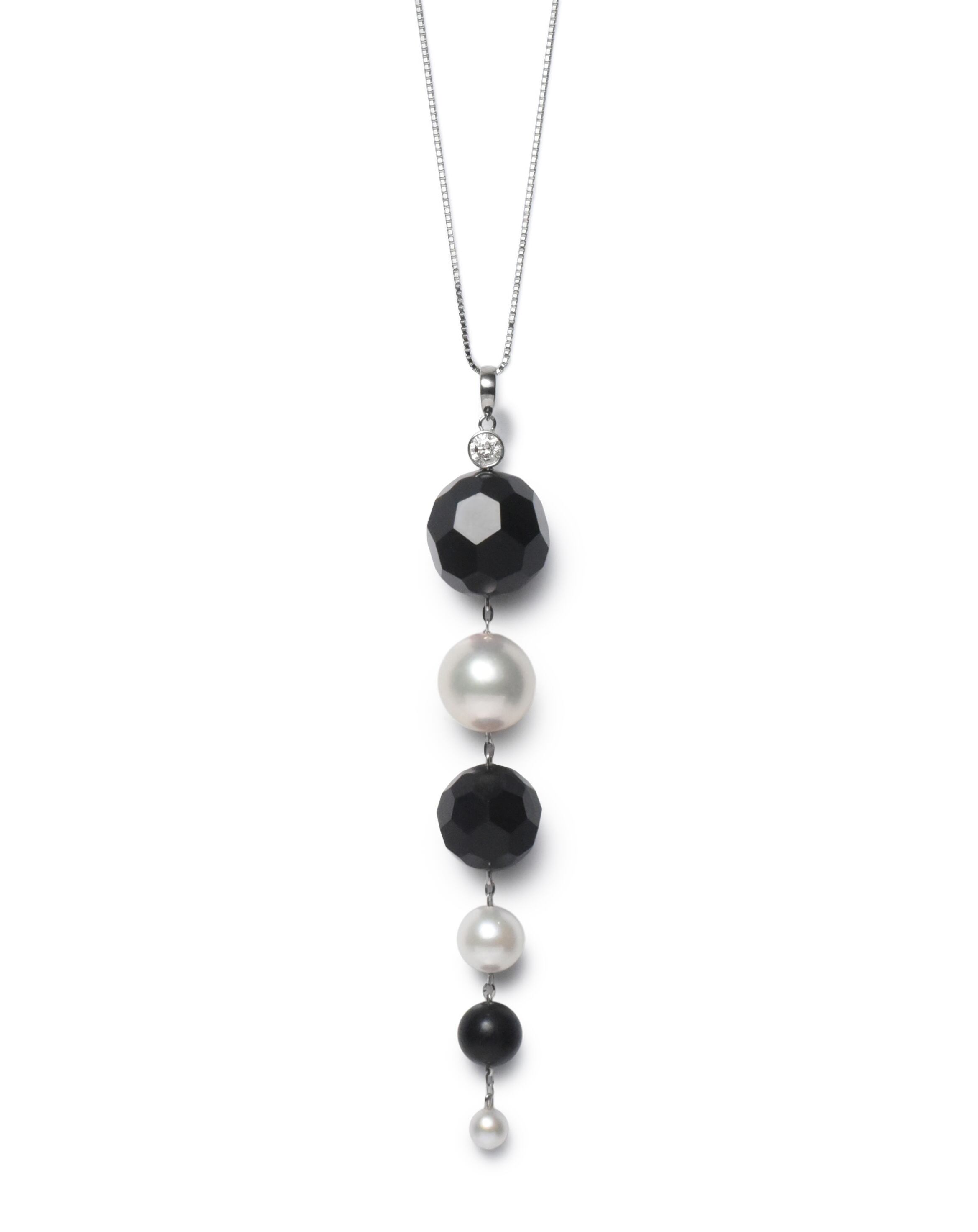 それぞれが揺れて動くようにセッティングされており、上から12mmの多面カットされたジェット・9mmのパール・10mmの多面カットジェット・6.5mmのパール・6mmの丸いジェット・3.5mmのパールと、白黒交互にサイズグラデーションで並べ、さらに一番上には0.08ctのダイヤモンドをあしらった、サイズ感も満天のペンダントです。